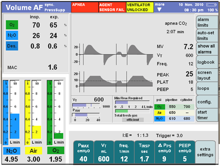 Up to three messages can be displayed simultaneously. In some cases, the corresponding measured values are highlighted on the screen by a flashing background in addition to the alarm message. If more than three alarms occur simultaneously, the symbol "more" appears to the right of the alarm field and the soft key show all alarms is activated on the right-hand side of the screen.