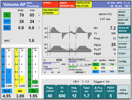When the soft key show all alarms is pressed, the upper curve display is replaced by up to six additional alarm fields for 15 seconds. If more than nine alarm messages are simultaneously active, the lowest priority alarms will not be displayed until the total number of active alarm messages falls below nine.