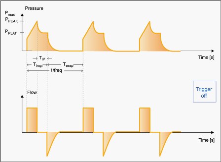 The respiratory cycle is defined through the frequency freq., the inspiratory time TINSP, the inspiratory pause time TIP:TINSP and the tidal volume VT.