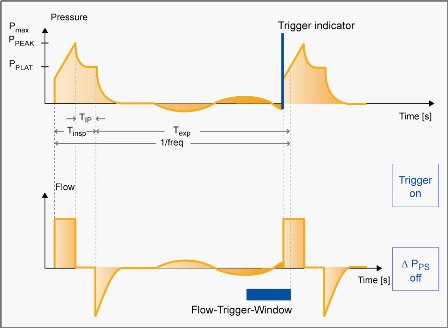 A ventilation breath triggered by the patient is indicated by a continuous line in the pressure curve and in the flow curve (trigger indicator). The active flow trigger window corresponds to the last 25% of the relevant expiratory time.