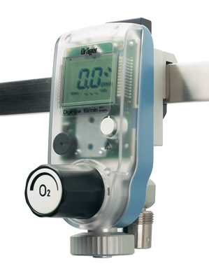 For rail mounting with rotatable NIST gas inlet for the attachment of a gas supply circuit with NIST union nut. Adjustment from 0.3 to 3 l/min in 0.1 increments, from 3 to 16 l/min in 0.5 increments. With M 34 x 1.5 port for reusable Dräger humidifier systems or nozzle. DigiFlow has a very high level of accuracy and the flow is easy to read.