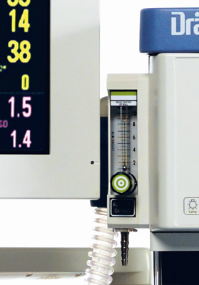 For rail mounting with rotatable NIST gas inlet for the attachment of a gas supply circuit with NIST union nut. Adjustment from 0.3 to 3 l/min in 0.1 increments, from 3 to 16 l/min in 0.5 increments. With M 34 x 1.5 port for reusable Dräger humidifier systems or nozzle. DigiFlow has a very high level of accuracy and the flow is easy to read.