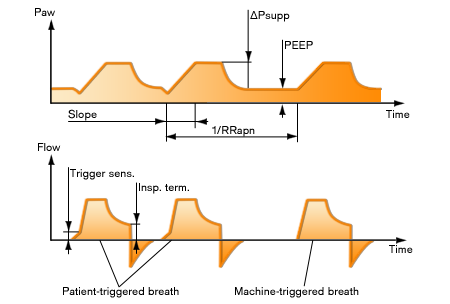 Each detected inspiratory effort at CPAP level induces a patient-triggered, flow-controlled, and pressure-supported breath. Point in time, number, and duration of pressure-supported breaths are determined by the patient. When no inspiratory effort is detected, pressure-supported breaths are delivered with the set minimum respiratory rate RRapn.